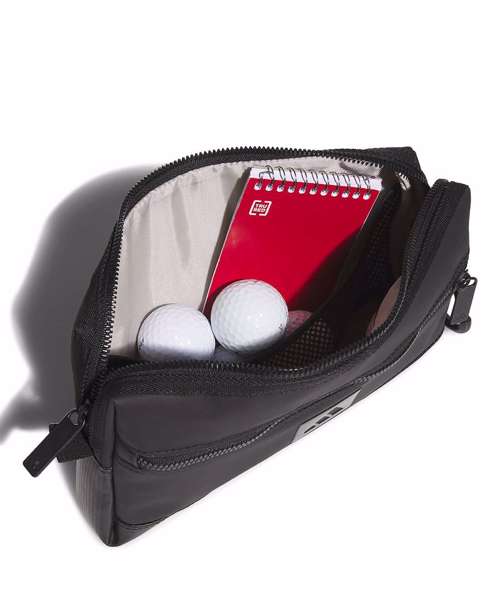 Golf pouch with water-resistant material and pockets for dry storage of essential items.