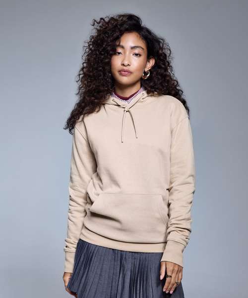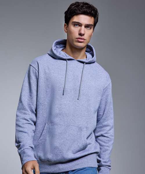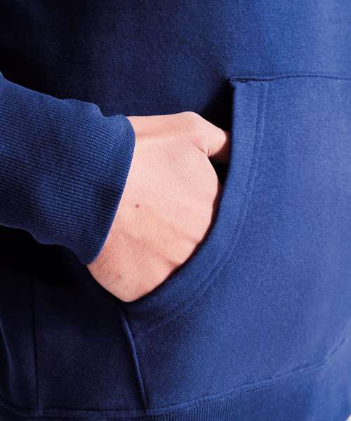 Soft hand feel. Double-fabric hood. Brushed inner fleece. Nickel-free, colour-matched eyelets and drawcord ends. Twin-needle detail. Cut and sew 1x1 ribbed cuffs and hem. Kangaroo pocket. Self-coloured neck size label.
