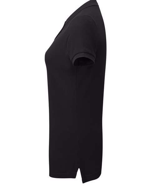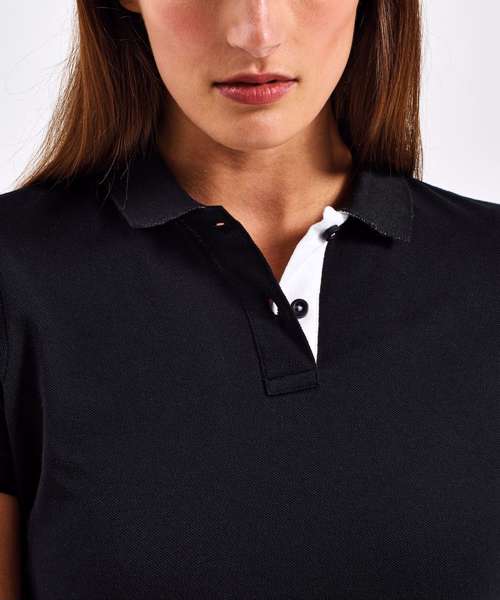 Fitted polo for women with contrast collar and placket. Two contrast coloured buttons on placket. Contrast colour on side vents. Twin needle stitching on hem. Ribbed knit collar and sleeve cuffs. Product contains no branded neck label. Removable Kimble or looped garment tags. Inner seam label holds important product information on one label with a second label containing brand information which can be cut-away. Please note old stock may contain a fixed branded label.