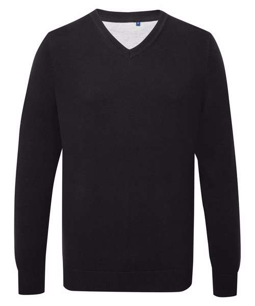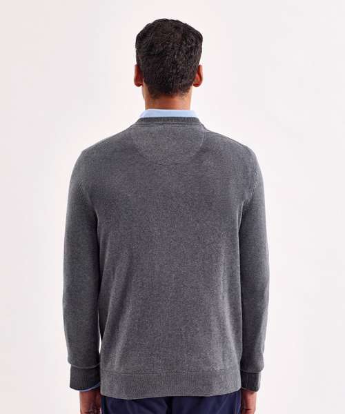V-neck style jumper. Patch on the inside reverse neck for a contrast effect. Decorative tuck stitching. Ribbed knit on the neckline, cuffs and hem. Product contains no branded neck label. Removable Kimble or looped garment tags. Inner seam label holds important product information on one label with a second label containing brand information which can be cut-away. Please note old stock may contain a fixed branded label.