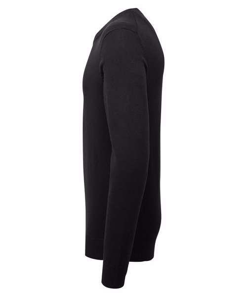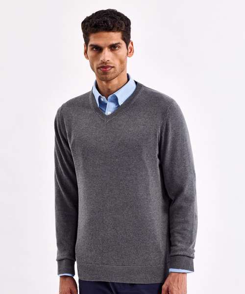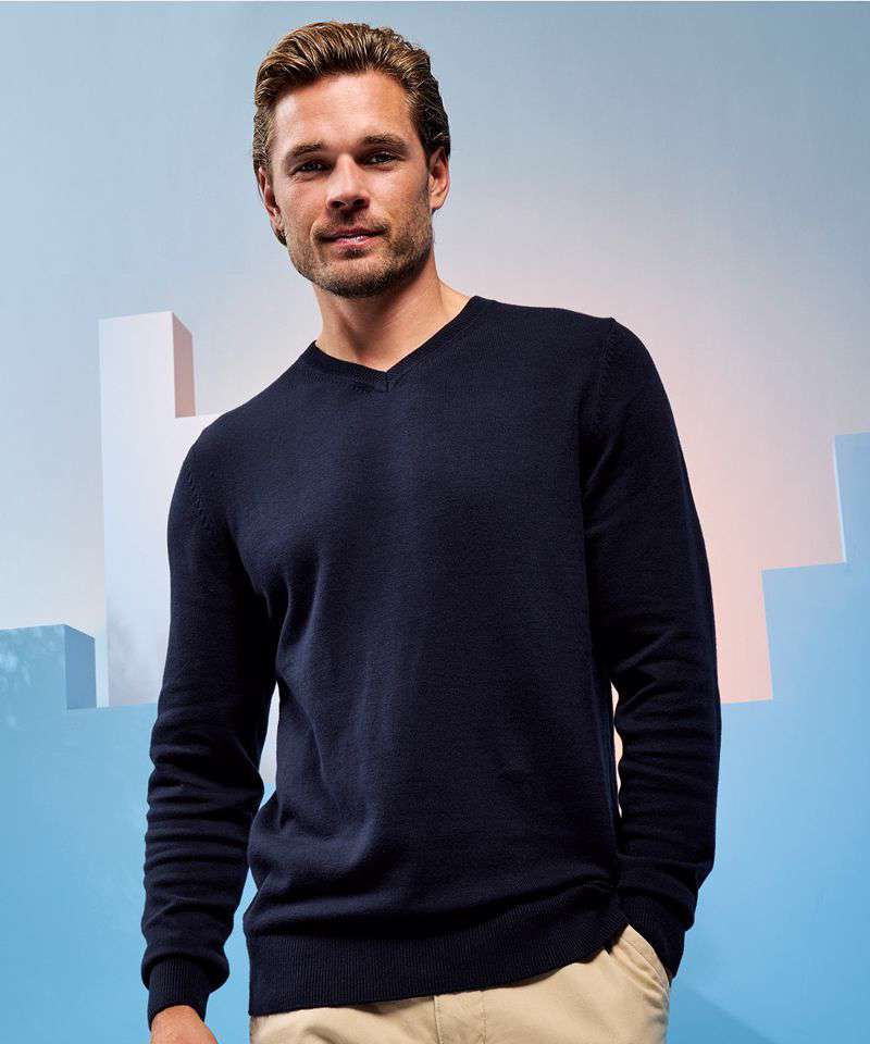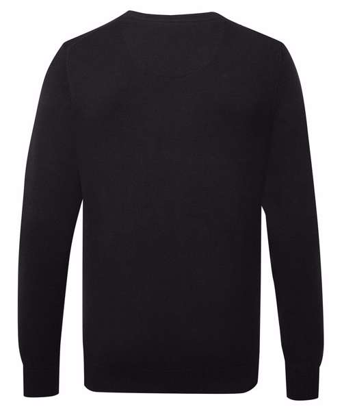 A great everyday sweater for men. The popular v-neck style allows for a shirt and tie to be visible underneath or can be worn without for a casual look. A patch on the underside reverse neck gives a stylish contrast effect. Decorative tuck stitching, ribbed knit on the neckline, cuffs and hem make for a classic and comfortable pullover for men.