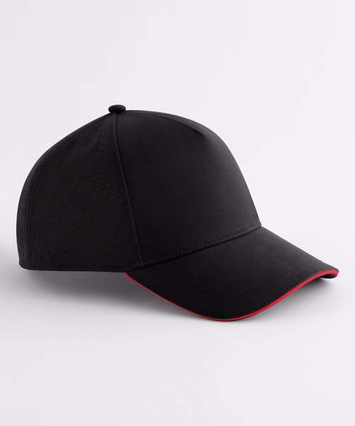 Laser-cut perforation to rear panels with colour lining. Moisture-wicking, ultra-soft sweatband provides all-day comfort. Five-panel design. Structured front panels. Pre-curved peak. Contrasting colour sandwich peak. TreadSnap size adjuster. Tear-away label for ease of rebranding. Contains 100% GRS-certified recycled polyester, certified by Control Union CU811033.