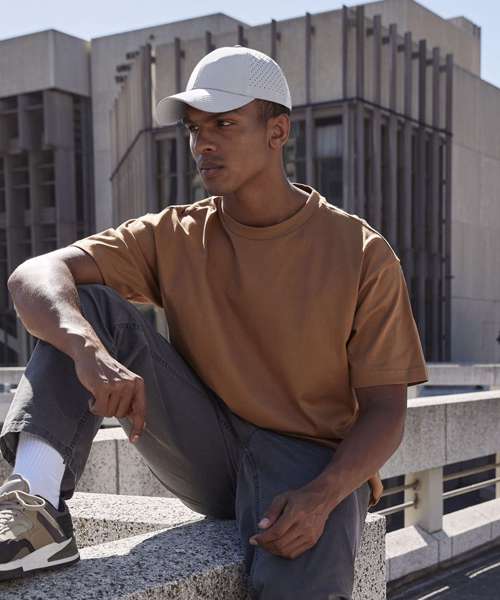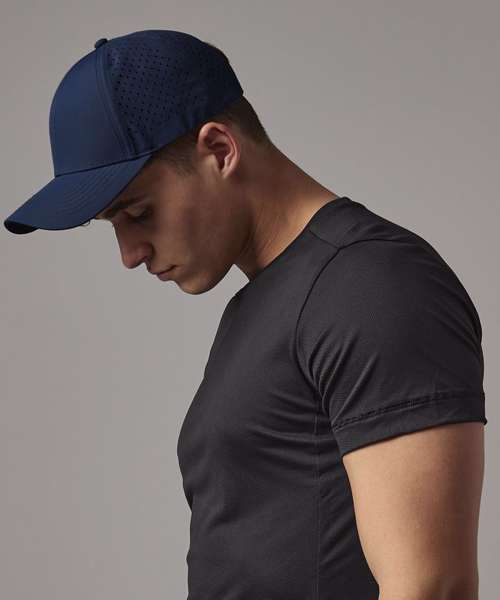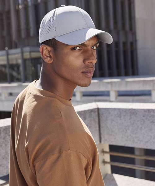 6-panel design. Pre-curved peak. Laser-cut ventilation for enhanced breathability. Snap-fastening strap adjuster. TearAway label for ease of rebranding. 100% Recycled polyester.
