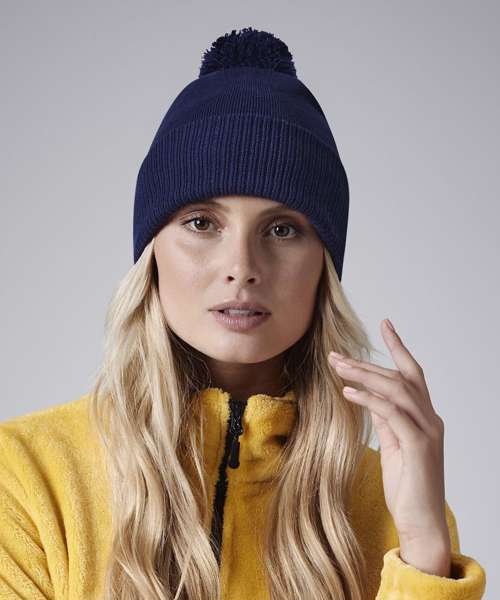 Contains 100% certified organic cotton. Double-layer knit. Ribbed cuff. Dual style – cuffed or slouch. Self-coloured pom pom. TearAway label for ease of rebranding.