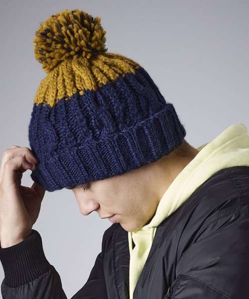 TearAway label for ease of rebranding. Heavyweight multi-yarn cable knit design. Bold two colour design. Luxury pom pom. Luxurious Shearling thermal band for extra warmth. Cuffed design for optimal decoration.