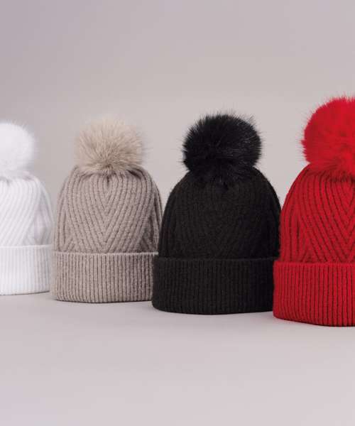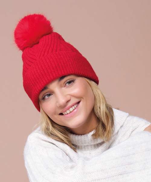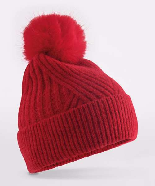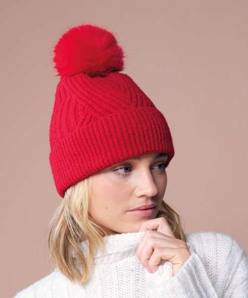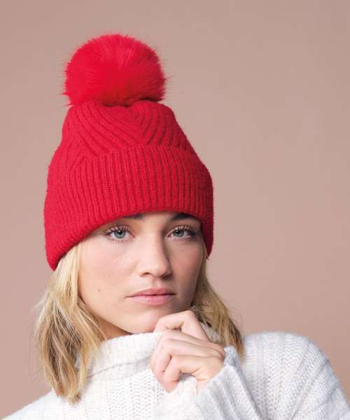 Sumptuous heavy ribbed knit. Soft-touch fabric. Retro styling. Luxury faux fur pom pom. Cuffed design for optimal decoration. TearAway label for easy rebranding.