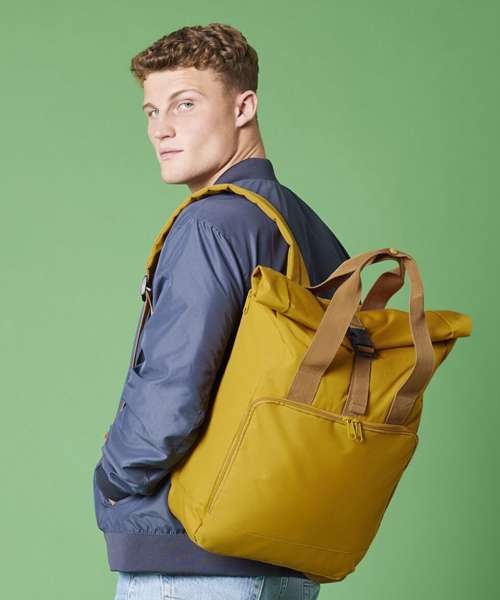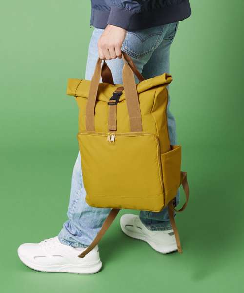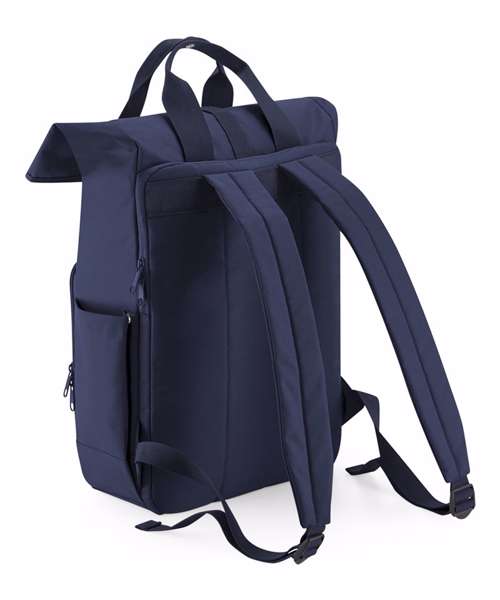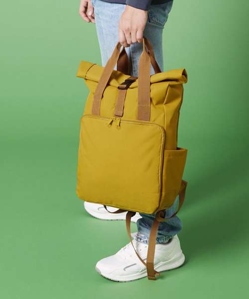 Made from 100% recycled polyester. This functional roll-top style features an easy access padded laptop compartment, external bottle pocket and zippered internal pocket. The front pocket has been designed for decoration and encloses an internal organiser. Padding in the back panel and adjustable shoulder straps give load carrying comfort and the roll-top closure provides fashionable functionality. Webbing carry handles add to the distinctive look and mean this style can be worn on the back or can be carried by hand.