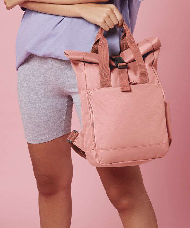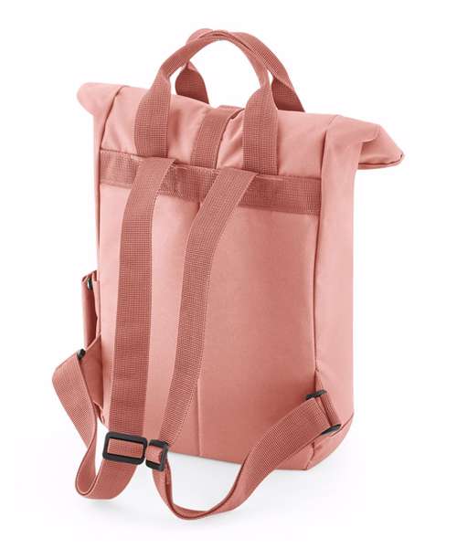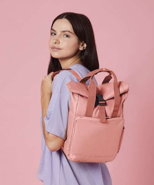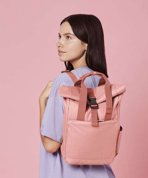 Contains 100% certified recycled polyester. Front pocket designed for easy decoration. External bottle pocket. Padded back panel. Roll-top closure. Webbing carry handles. Fully adjustable shoulder straps. TearAway label for ease of rebranding.