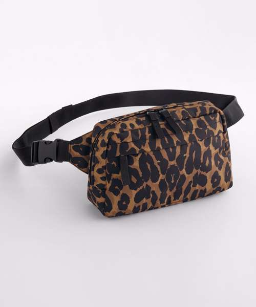 Leopard print design. Rear zipped pocket. Zipped main compartment. Zipped front pocket. Two-way zipped opening for easy access. Fully adjustable waist strap. Tear-away label for ease of rebranding. Contains 100% GRS-certified recycled polyester, certified by Control Union CU811033.