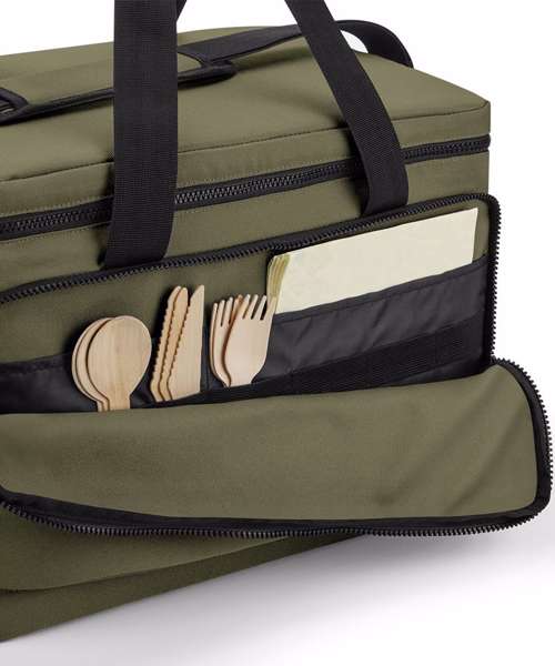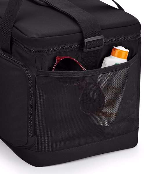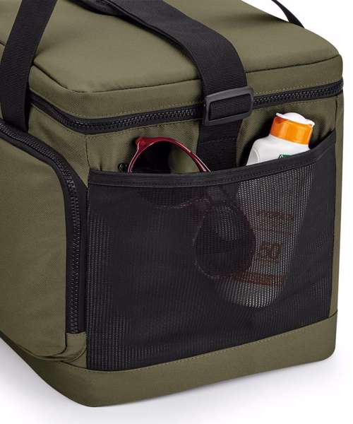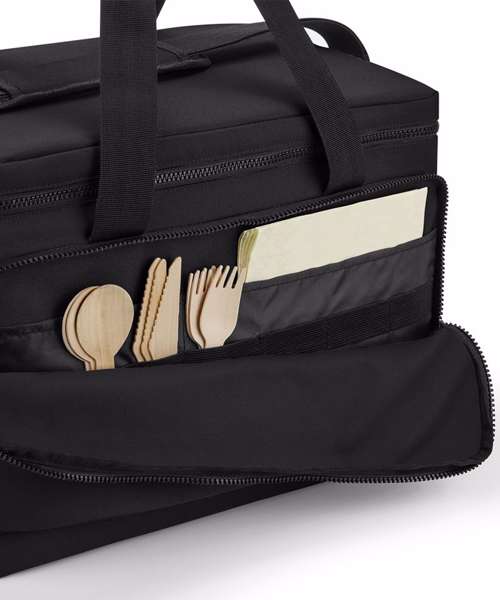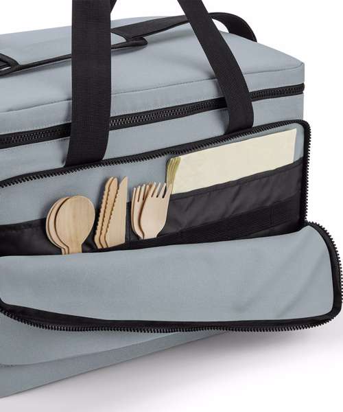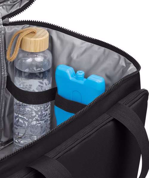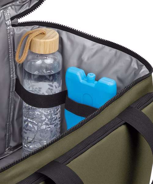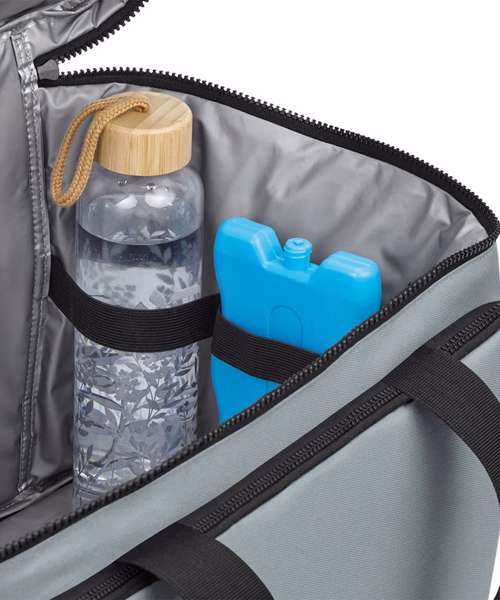 100% Recycled 600D polyester. PVC-free. PEVA lining – BPA-free. Food-safe, fully insulated main compartment. Zipped main compartment. Zipped front pocket. Stretch mesh side pocket. Wipe-clean interior. Internal water bottle/ice block holders. Twin carry handles. Cord zip pulls with reflective detailing. Adjustable webbing shoulder strap. TearAway label for easy rebranding.