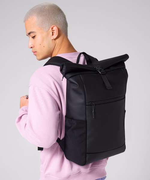 PVC-free. Minimalist styling. Water-resistant materials. Zipped main compartment. Elasticated mesh side pockets. Internal padded laptop sleeve, compatible up to 16". Padded back panel. Front pocket with water-resistant zip closure. Secure roll-top and clip closure system. Cord zip pulls with reflective detailing. Padded, adjustable shoulder straps. Grab handle. Tear-away label for ease of rebranding. Lining: 100% Recycled polyester.