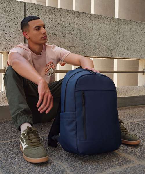 Contains 100% recycled 900D polyester with PU coating. Water-resistant materials. Padded laptop compartment compatible up to 16". Separate padded iPad/tablet pocket. Zipped main compartment. Zipped front pocket. Elasticated side pockets. Padded back panel. Padded base. Water-resistant zip closures. Padded adjustable shoulder straps. Grab handle. Adjustable chest strap. TearAway label for ease of rebranding. Global Recycled Standard (GRS-certified, CU811033).