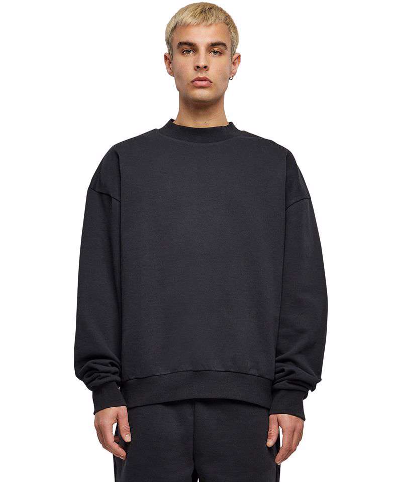 A basic all-rounder, made from heavy cotton, this men’s long sleeve sweatshirt presents a wide, urban fit with dropped shoulders. Styled with a wide ribbed collar and rib cuffs on the sleeves and hem, it can further be refined with screen or flex printing.