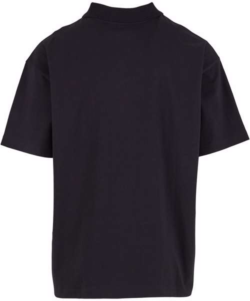 Oversized fit. Dropped shoulders. Polo collar with two-button closure.
