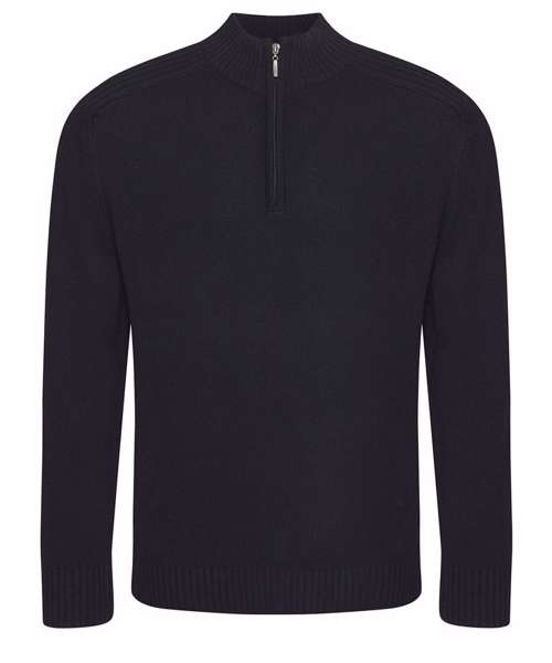 Long sleeve sweater made from regenerated cotton with tall collar and ¼ zip neck. Contrast rib stitches at shoulders cuff and hem.