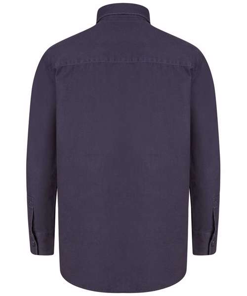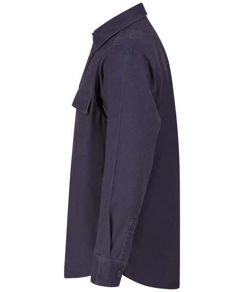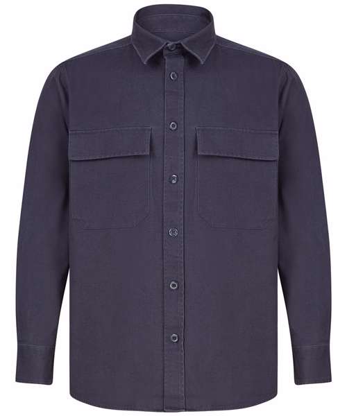 Heavyweight overshirt. Heavy garment wash. Back yoke. Twin-needle topstitching. Plastic horn-effect buttons. Mitred patch pockets with flap. Mitred cuff and placket with button fastening. Curved hem. Forward shoulder seam. Tag-free for easy rebranding.