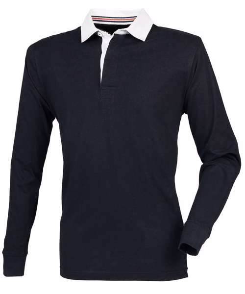 Get your hands on the Premium superfit rugby shirt. This slim fit shirt has a peached fabric for a super-soft finish. There is plenty of space for decorating opportunities and it's tag free for easy rebranding. It has a traditional woven rugby collar with zigzag stitching detail under collar and contrast striped tape in the back neck and side vents. Carefully chosen fabrics and clever detailing characteristic of Front Row.