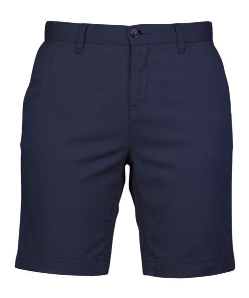 Flat front chino short. Tag free. Stretch fabric for ease of movement. Slanted front pockets. 2 x back welt pockets. Belt loops. Plain hem.