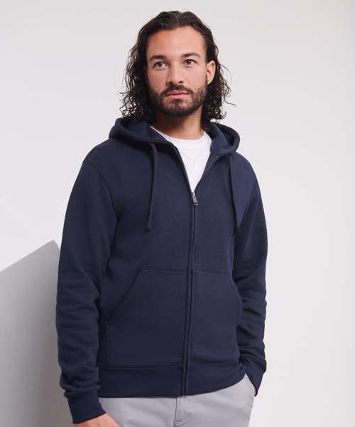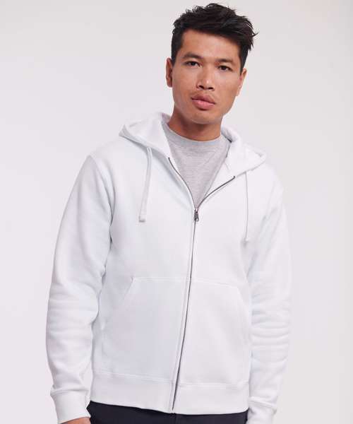 Ultra contemporary zipped hooded sweat in premium 3 layer fabric for a fuller, more substantial and luxurious handfeel. Coverseamed armholes, cuffs and hem. Overseam around hood. Herringbone neck tape. Flat, chunky drawcords. MP3 access. YKK metal (antique silver) full zip. Kissing (covered) zip for full cross body decoration. Buttonhole eyelets. Front facing shoulder seams. Premium finishing. Part of the Russell sweatshirt family that continues to perform wash after wash.