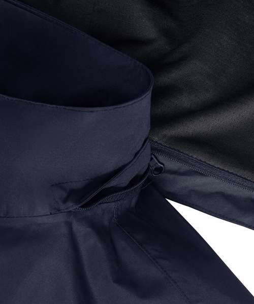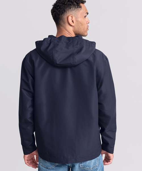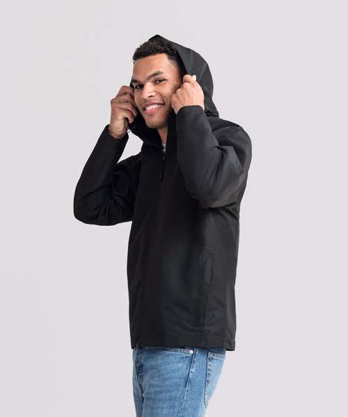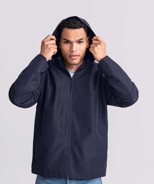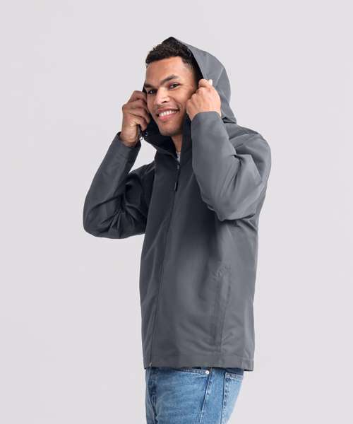 Classic fit. Clean, minimalistic design. Two side pockets and one inside pocket. Adjustable three-part removable hood. Inside-out front zip with cord pull. Discreet decoration access at the hem. Breathable up to 2000g/m² per 24 hours. Waterproof material, minimum 2000mm. 100% Recycled polyester.