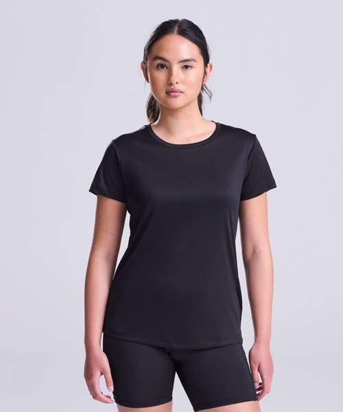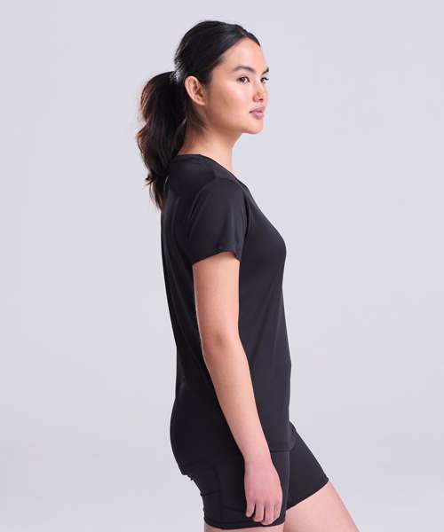 Classic crew neck T with girlie fit. Featuring high performance wicking fabric, crew neck and smooth fabric face.