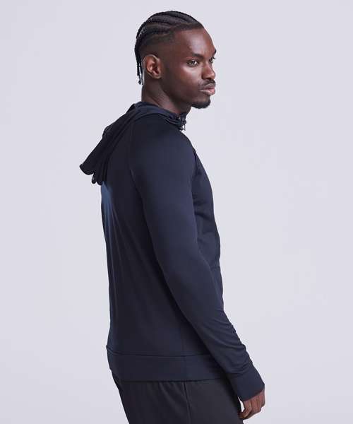 Sports zoodie with adjustable drawcords hood, raglan sleeves with thumb holes and full-front zip. Contrast fabric on sleeves and body.