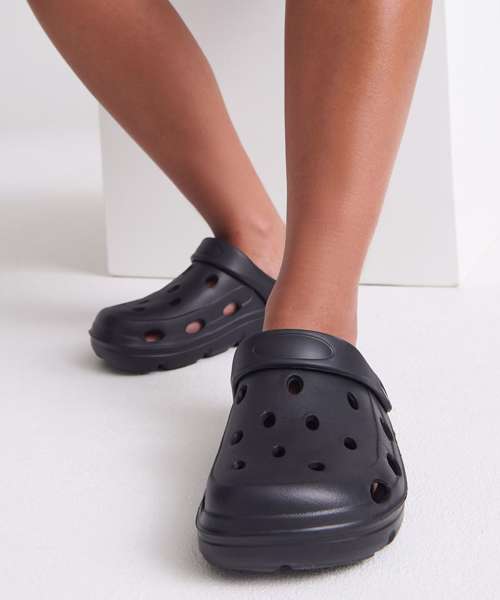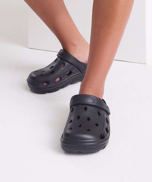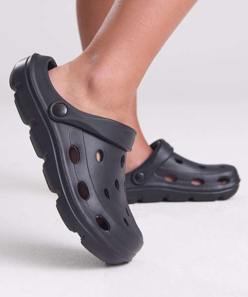Slip-on style. Moveable heel strap, providing a secure fit. Ventilation holes for breathability. Lightweight.
