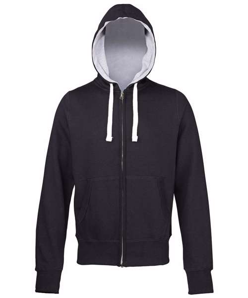 Full zip hoodie. Side panels for stylish fit. Brass zip covered with chunky rib detail. Overlock stitching detail throughout. Double fabric hood with heather grey waffle fabric inner. Chunky white flat lace drawcord. Kangaroo pouch pocket. Deep ribbed cuff and hem. Soft cotton faced fabric creates ideal printing surface.
