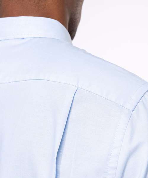 70% Oxford cotton/30% polyester. Easy-care fabric. Button down collar. Matching buttons. V-shaped left chest pocket. Double back yoke with 2 side pleats. 2 spare buttons. Shaped hem. Certified STANDARD 100 by OEKO-TEX® N° CQ 1007/7, IFTH.