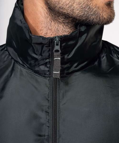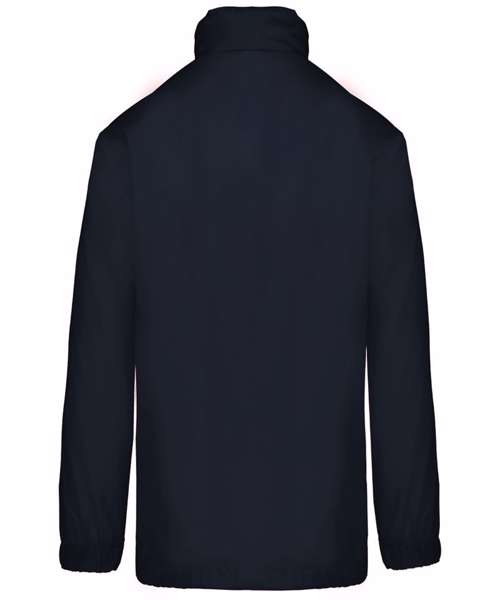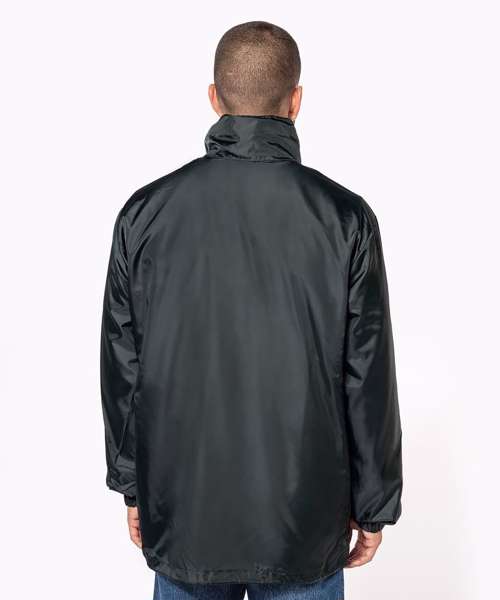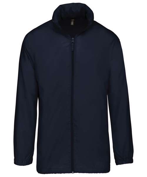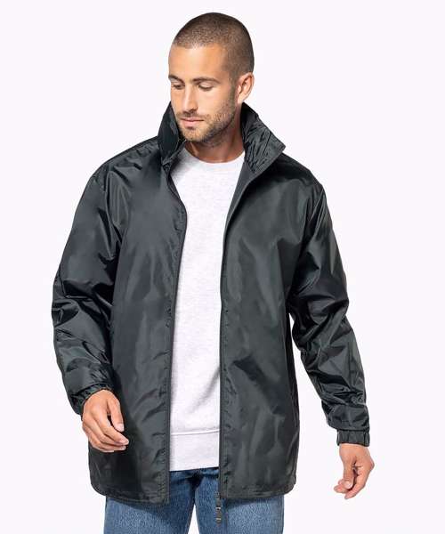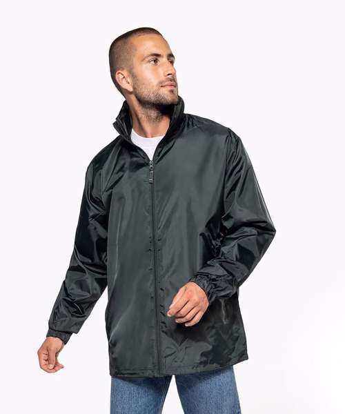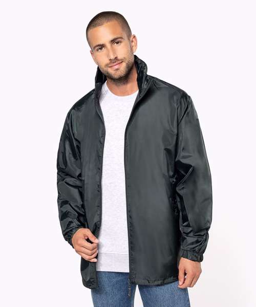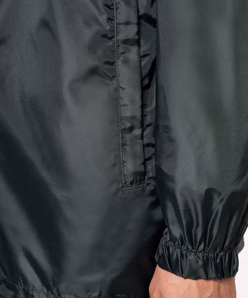 100% polyester. Concealed hood with tear release fastening tab. 2 front zipped pockets. Drawstring at bottom. Elasticated cuffs. Packs/zips into front pocket. Full front zip. BSCI certified. SEDEX certified.