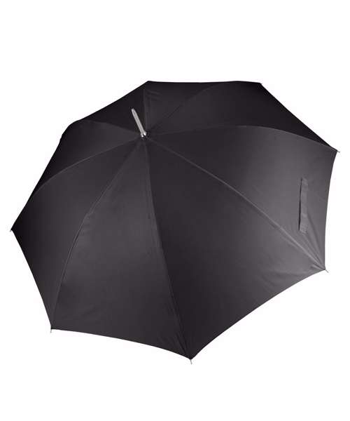 23" (58.5 cm) Golf umbrella, auto opening, thick black metal pole. 10 mm, black fibreglass frame, metal rib tips, golf handle in matt finish polycarbonate, polyester 210T canopy. BSCI certified.