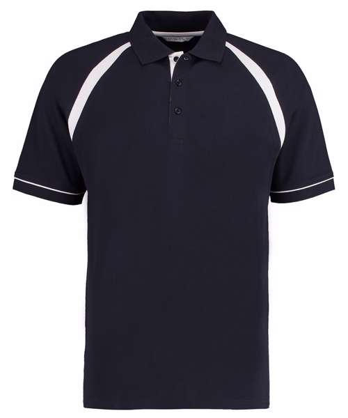 Contrast curved panels down raglans front and back with single needle stitching. 1x1 rib flat knit collar. 3-button slanted top placket. Inner contrast placket. Taped shoulder seams. Contrast herringbone taped side vents. Contrast piping at sleeve cuff. Twin-needle hem. Spare button. Kustom Kit® woven back neck label.