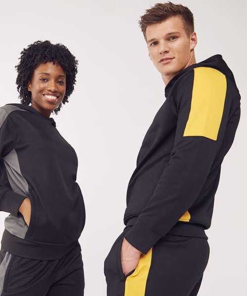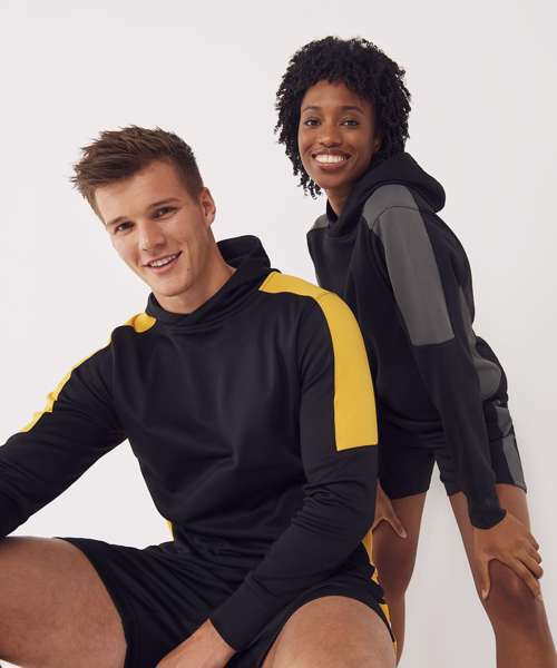 Unisex adults’ polyester hoodie with brushed back fleece inner for comfort. Contrast sleeves and side panelling on contrast only. Ribbed cuffs and hem. Crossover hood neck at centre front. Zipped welt pocket in front panel side seam. Three-piece hood. Offered in contrast and solid colours. Tear-out label.