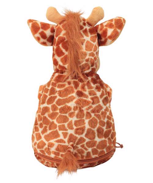 The bold giraffe print hugging this toy has cute contrast hooves and horns, topped off with a shaggy ginger mane and tail. Put your neck out and add eye catching decoration to the wide tummy space, using the zip on the base of the toy.
