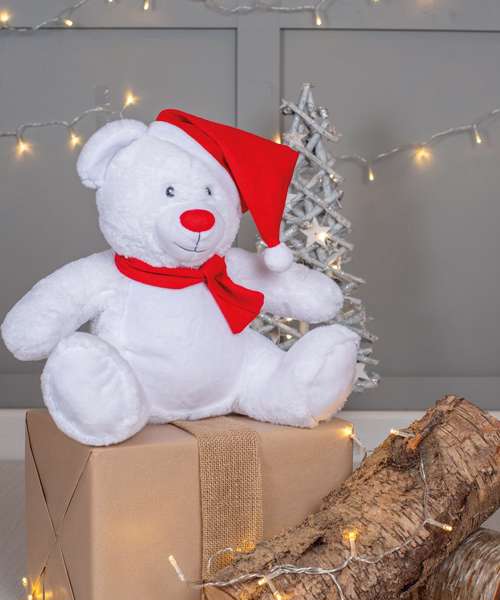 The Christmas Zippie bear has a zip around the bottom to allow direct access for decoration. Removable inner stuffing. Sewn eyes and mouth. Red knitted scarf with red Christmas hat over one ear. Suitable for all ages. Complies with EN71 regulations.