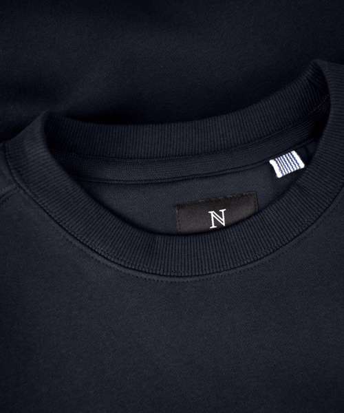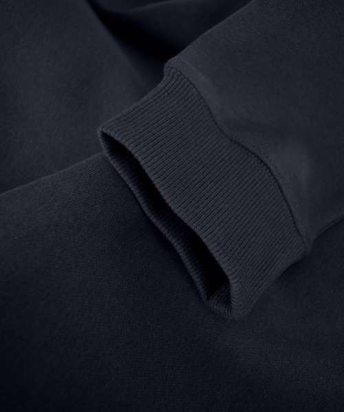 Combed long-staple organic cotton. Brushed fleece lining with short-shave treatment. Forwarded shoulder seems. Ribbed collar, hem and sleeves. Organic cotton. Recycled polyester. Organic Content Standard Blended (OCS Certified, CU1038206).