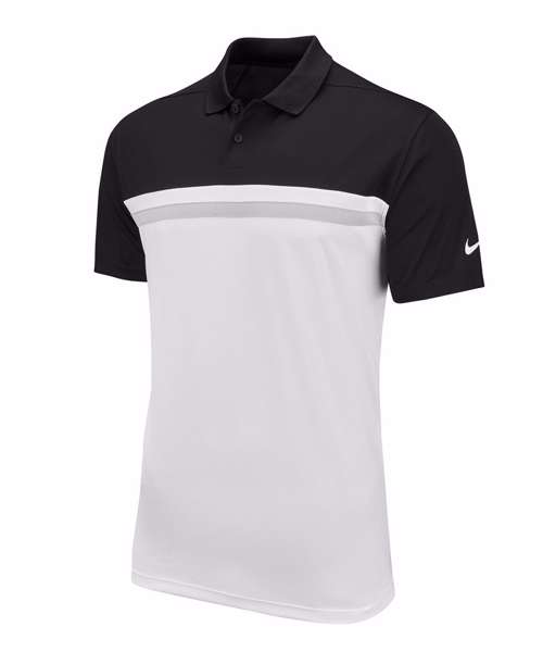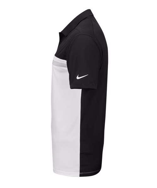 Nike Dri-FIT technology moves sweat away from your skin for quicker evaporation, helping you stay dry and comfortable. Shoulder seams are rolled forward so you can fully power through your swing. Collar is ribbed to help prevent curling. Swoosh is on the left sleeve so you can easily apply custom graphics like a logo or a crest to the chest.