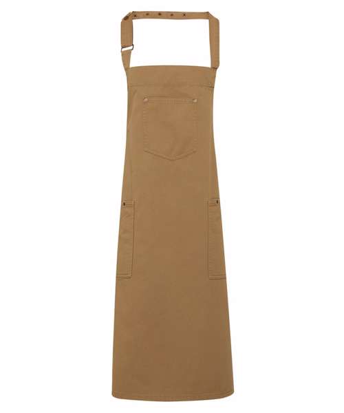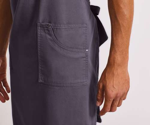 A full bib apron with style features taken from the popular 'chino' style. A stitched patch pocket with rivets features at the centre top and two side pockets big enough to carry tablet devices sit just below waist height. The neck strap is loose and the wearer can loop the end through the buckle and use the pop-snap buttons to fasten in place.