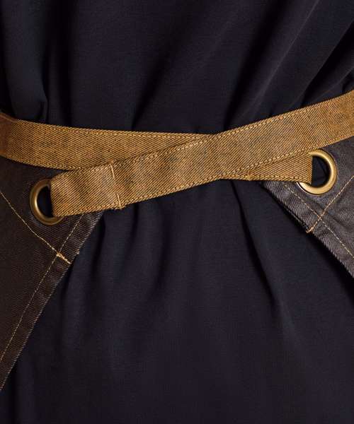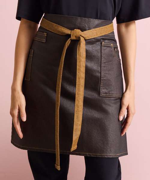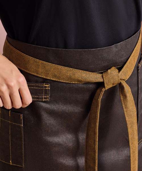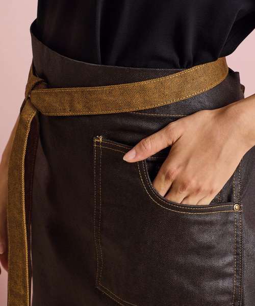 A mid-length waist apron boasting style accents from your favourite pair of jeans! An oversized patch pocket roomy enough for a tablet device with classic stitched pocket detail for styling. The waxed effect gives a tough, durable appearance with an industrial-chic feel that reflects the interior decor of many modern day restaurants.