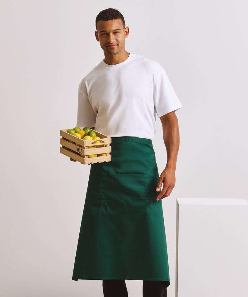 A bar apron that falls to a length of 80cm offering the wearer maximum coverage. This apron is part of the 'Colours' collection from Premier. To the centre of the apron is a useful centre pocket for carrying tablet devices, together with a combined pen compartment.