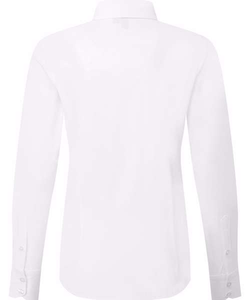 Women’s long sleeve poplin shirt made with certified recycled polyester and cotton. Soft collar styling. Full button-through with pearlised buttons on white and self-coloured on black. Two-button cuff. Sleeve guard with single button. Curved hemline and back darts for a feminine fit. Easycare fabric.
