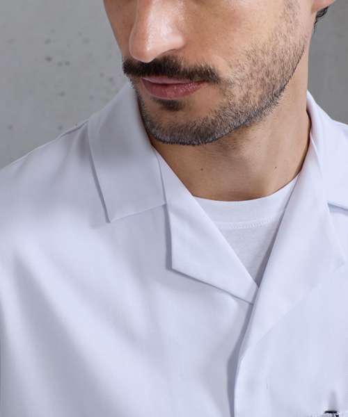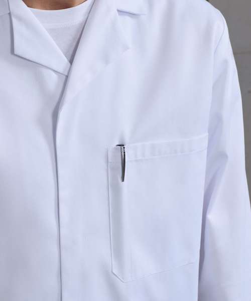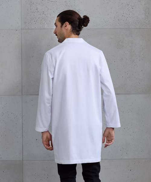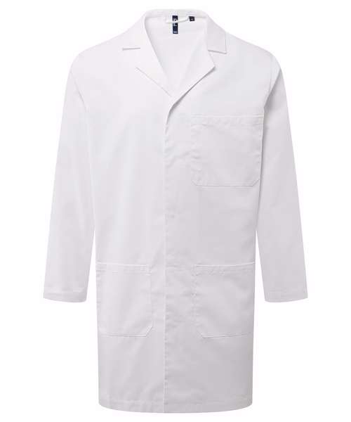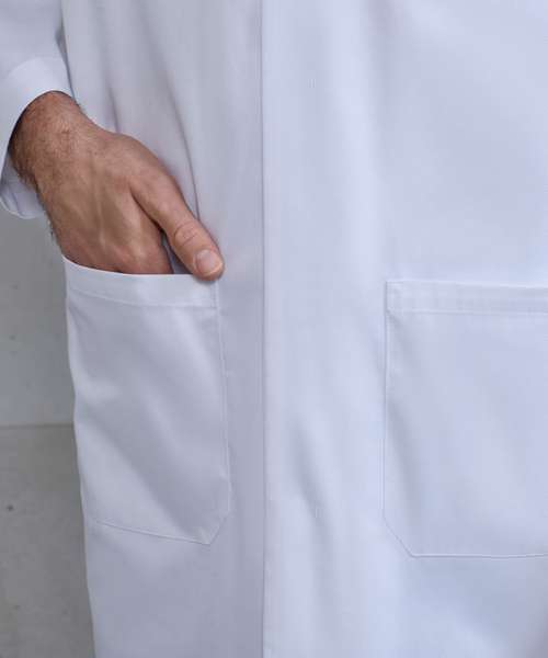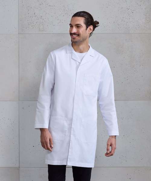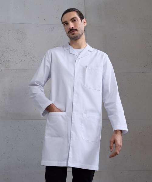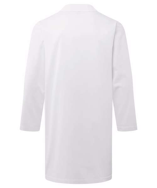 Classic three-pocket workcoat. Unisex styling. Two large lower patch pockets. Left chest patch pocket with pen holder. Lapel collar. Five concealed press stud buttons for fastening. Bar tacking for extra reinforcement. Loop on the inner neck for hanging up. Designed to withstand industrial washing for cleanliness and hygiene. Contains certified recycled polyester.