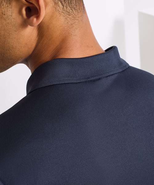 Men’s short sleeve polo shirt made from certified recycled polyester with production method that has a reduced environmental impact for creating spun dyed yarns. Moisture management properties to the fabric guarantee a breathable and wicking performance, so the wearer stays fresh and cool. Styled with a ribbed collar, three-button placket and side vents.