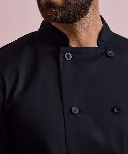An easycare long sleeve chef's jacket with a ten-button wrap over style fastening. To withstand the demands of repeated washing, the buttons are long-life resin buttons. A smart jacket for chefs with a mandarin collar for a streamlined look. Available in black, white and steel across a wide range of sizes.