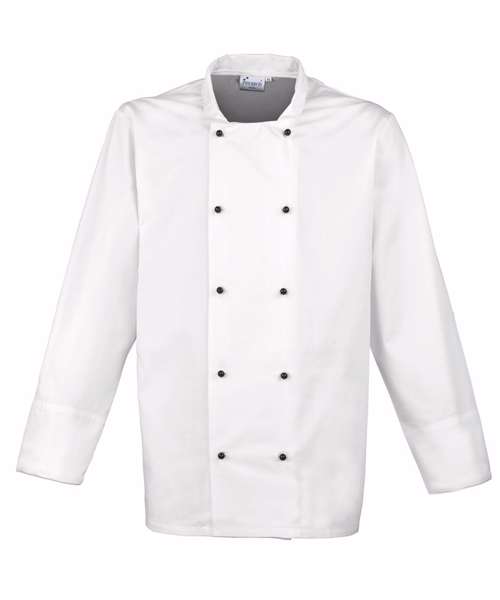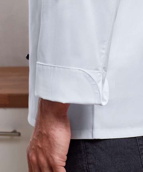 A chef's jacket that features black plastic stud buttons that can be removed and replaced with other colours (PR652) so the culinary team can reflect restaurant branding. Designed with a Mandarin collar with top stitching and turn back split cuffs.