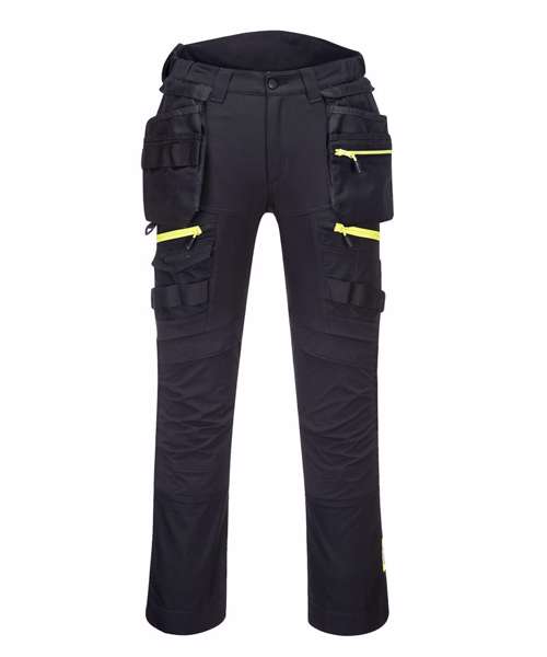 DX4 Detachable holster pocket trousers are ergonomically designed and use the targeted placement of dynamic 4X stretch fabrics to provide maximum range of movement when working. They feature a high-rise back waistband with side elastication, ensuring protection in all working positions, as well as pre-bent, top-loading, adjustable kneepad pockets. Generously-sized front pockets and multifunctional zip thigh pockets offer secure storage of phone, pens and tools. They’re triple-stitched throughout, for maximum durability.