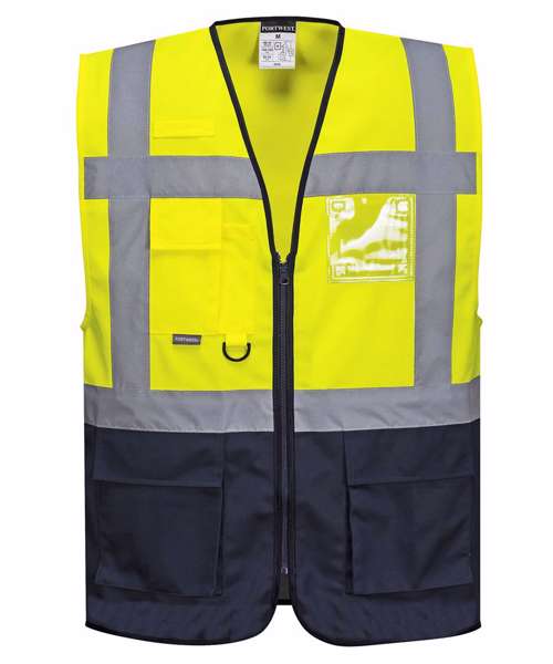 PW924 (S476) Yellow EN ISO 204714 CLASS 2. Revolutionary in its design, the executive vest combines the light weight of a waistcoat with the practicality of pockets for those situations when a jacket may be too warm. A clear ID pocket for security passes and cards complements this unique garment. CE certified. Reflective tape for increased visibility. Front zip opening for easy access. Concealed mobile phone pocket. Phone and pen holder pocket. Radio loop for easy clipping of a radio. Dual ID holder allows use of both portrait and landscape ID card display. D-ring for keys or ID cards. PW924 (C476) Yellow /Navy EN ISO 204714 CLASS 1. This two-tone option executive vest range is available in Yellow/Navy.