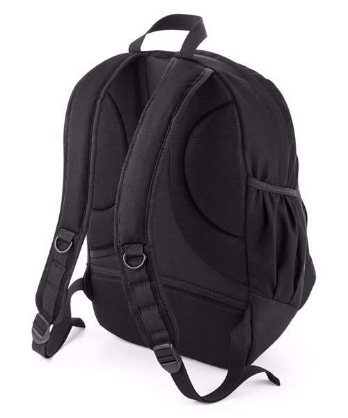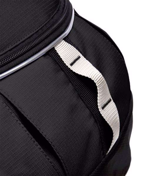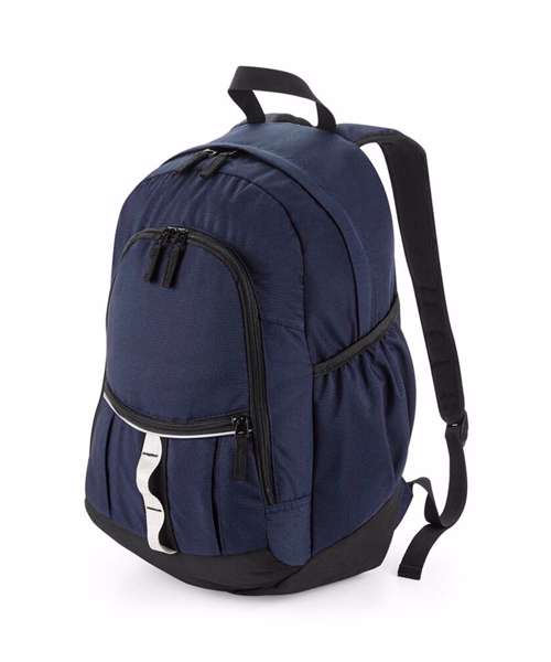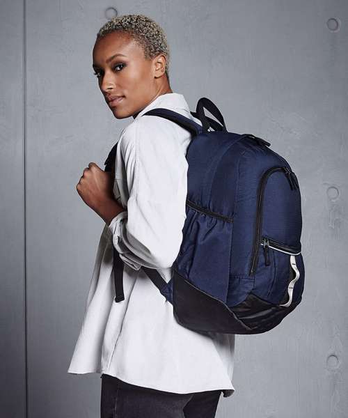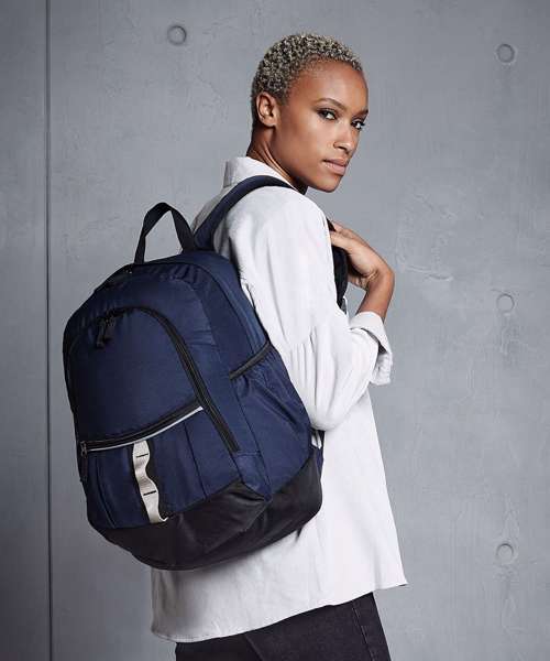 Padded adjustable shoulder straps. Ergonomic padded back panel. Media pocket and headphone port. Front pocket organiser section. Zippered small front pocket. Reflective strip. Grab handle. Elasticated side pockets.