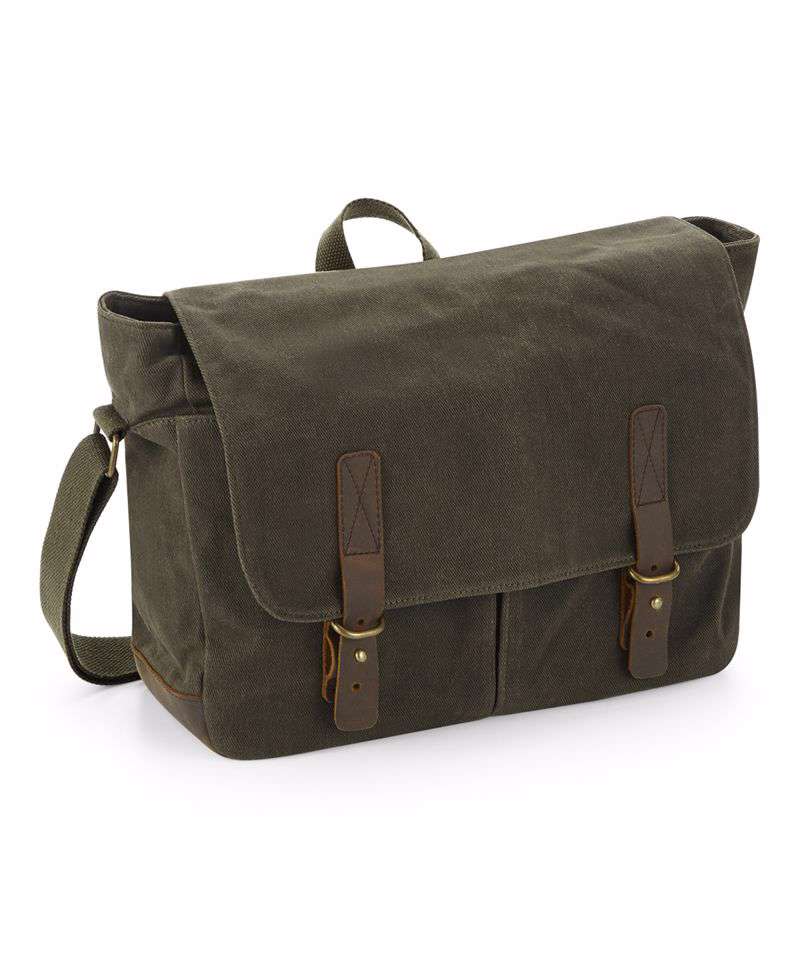 TearAway label for ease of rebranding. Genuine leather accents. Zippered main compartment.Dual front slip pockets. Secure stud fastenings. Antique brass effect fittings. Fully lined. Internal slip pocket. Laptop compatible up to 14". Cotton webbing grab handle. Adjustable shoulder strap. BSCI certified. Reach certified.