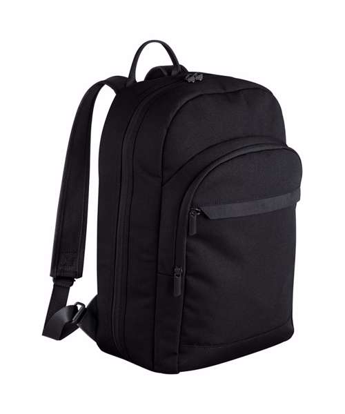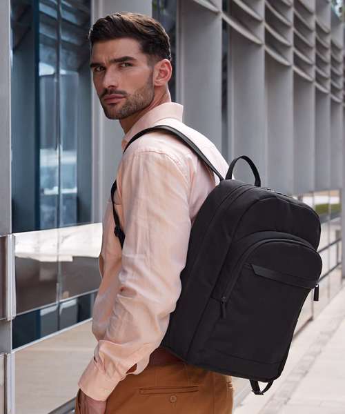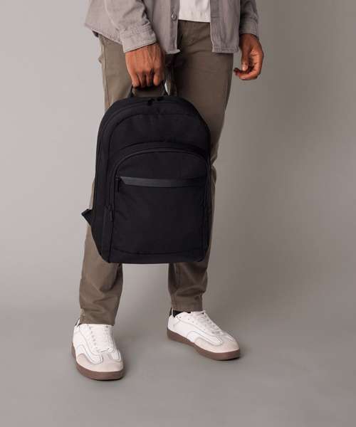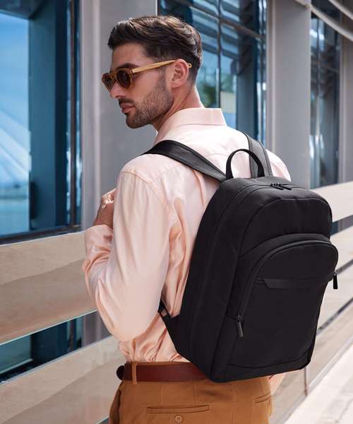 Minimalist styling. Zipped main compartment. Wide zip opening for easy access. Internal padded tablet/laptop sleeve up to 13". Zipped internal mesh pocket. Two internal slip mesh pockets. Internal bottle hoop. Premium finish internal lining. Outer zipped front pocket with rain flap and internal slip pockets. Luggage strap with discreet zipped pocket. Grab handle. Underseat cabin luggage size – suitable for most airlines (40 x 30 x 20cm). TearAway label for ease of rebranding. 100% certified recycled polyester fabric.